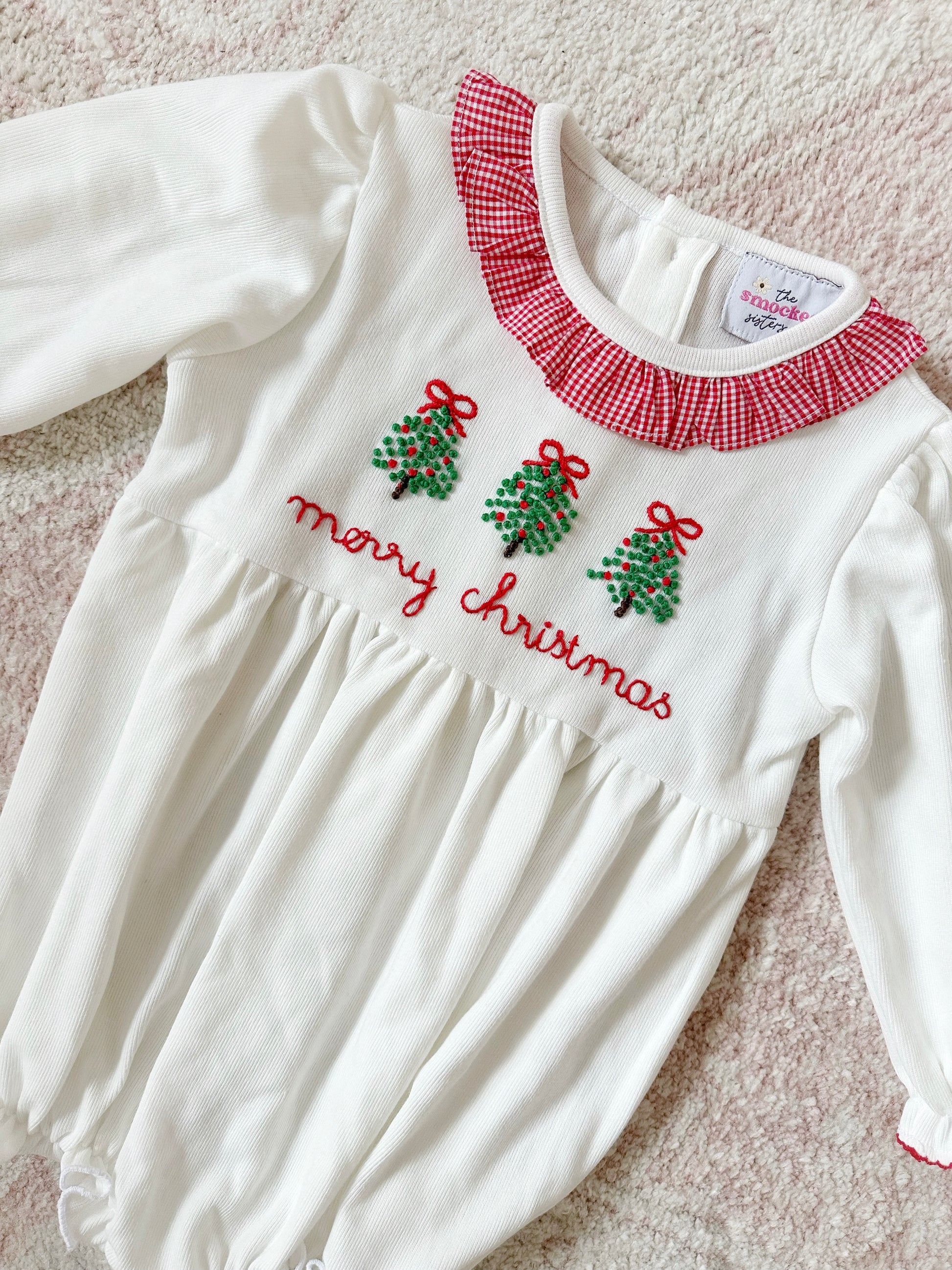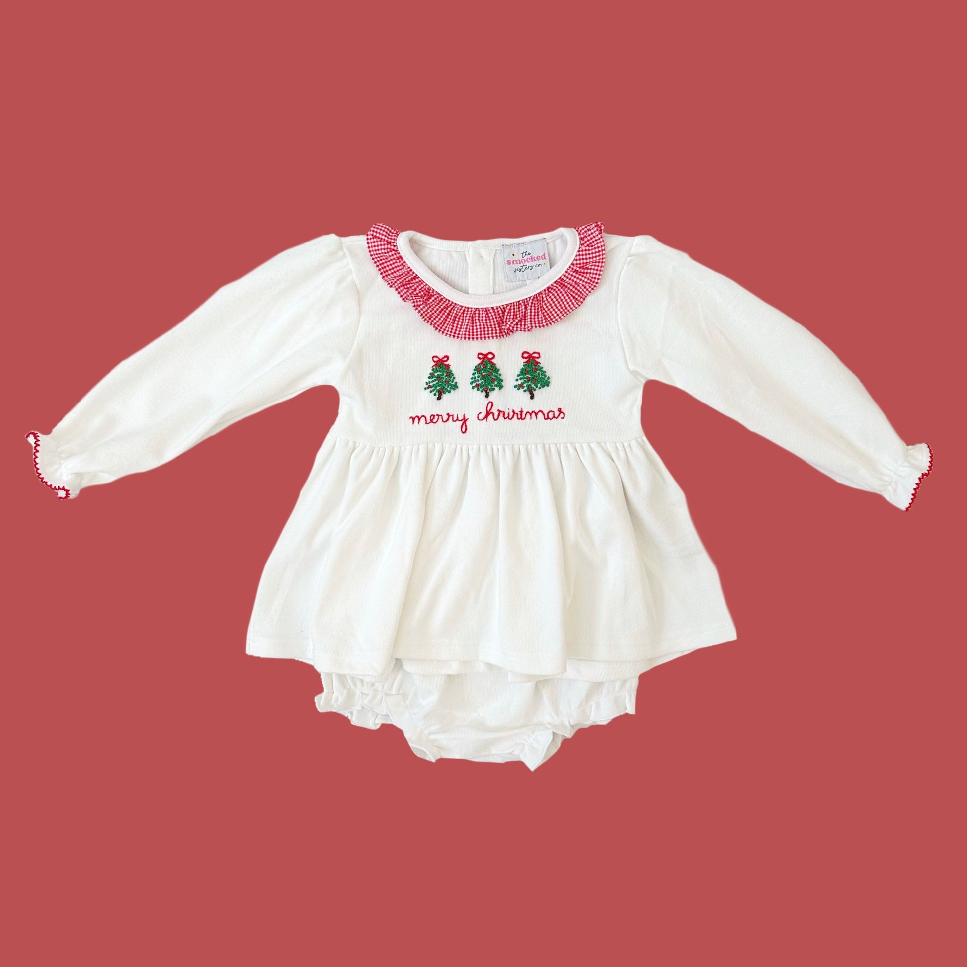 - This diaper set is made in a soft sweater material fabric and is the perfect comfy Christmas outfit! It features “merry Christmas” in red embroidery along with French knot Christmas trees!