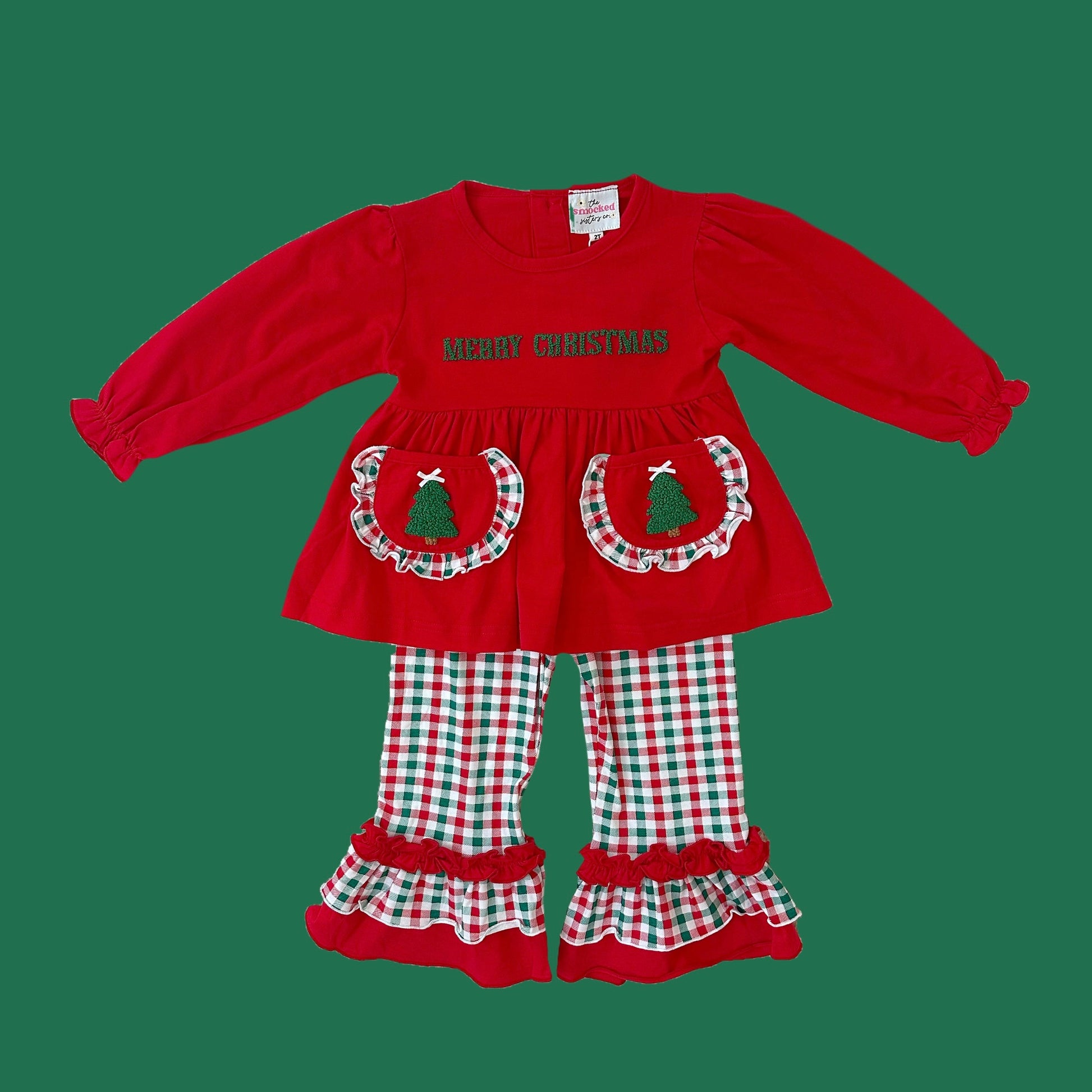 - This pant set is made in a soft quality knit fabric and is the perfect comfy Christmas outfit! It features “Merry Christmas” in French knot along with French knot Christmas trees on the pockets!