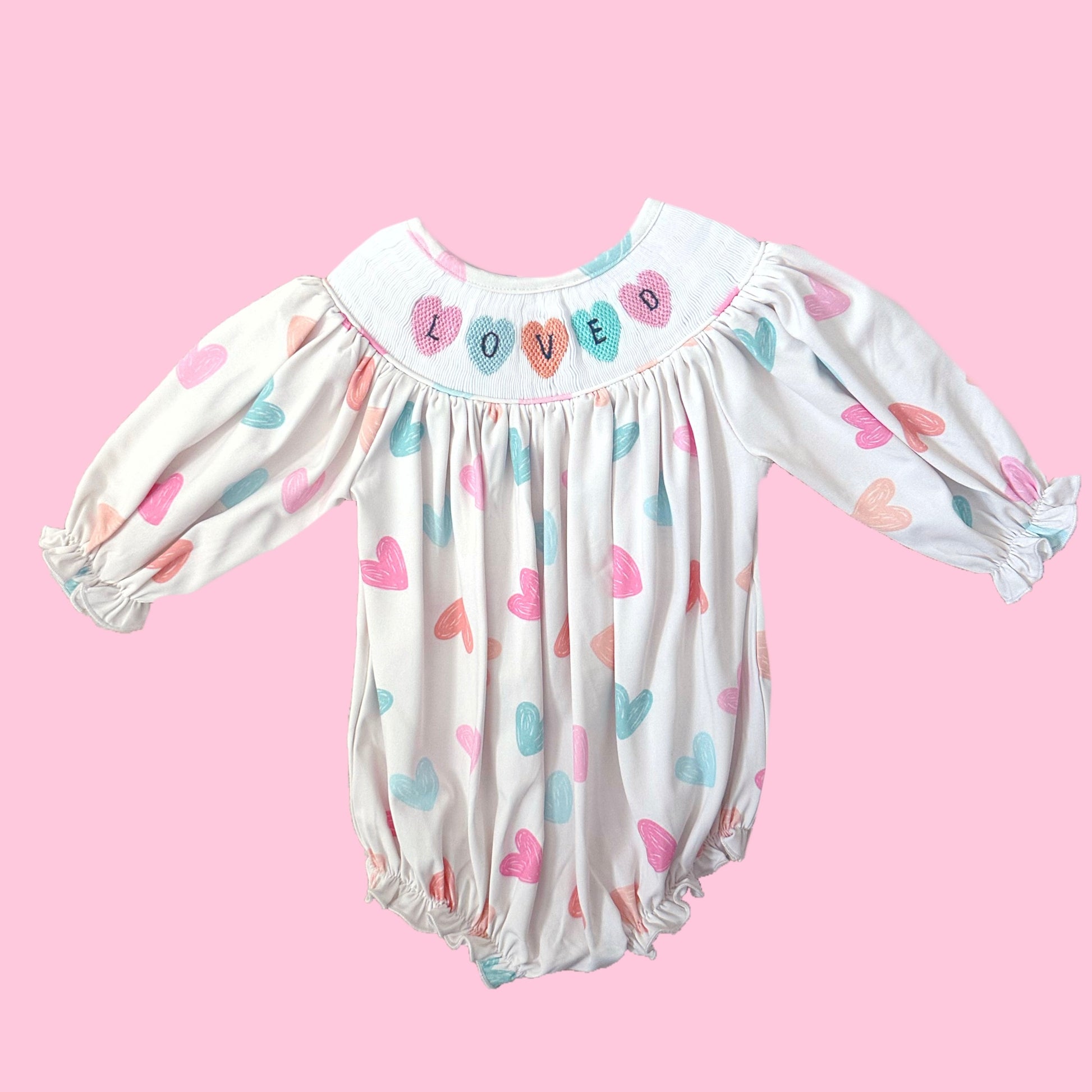 - This pastel heart bubble is made in a soft, quality fabric with "LOVED" hand stitched within multi colored hearts on the smocking plate