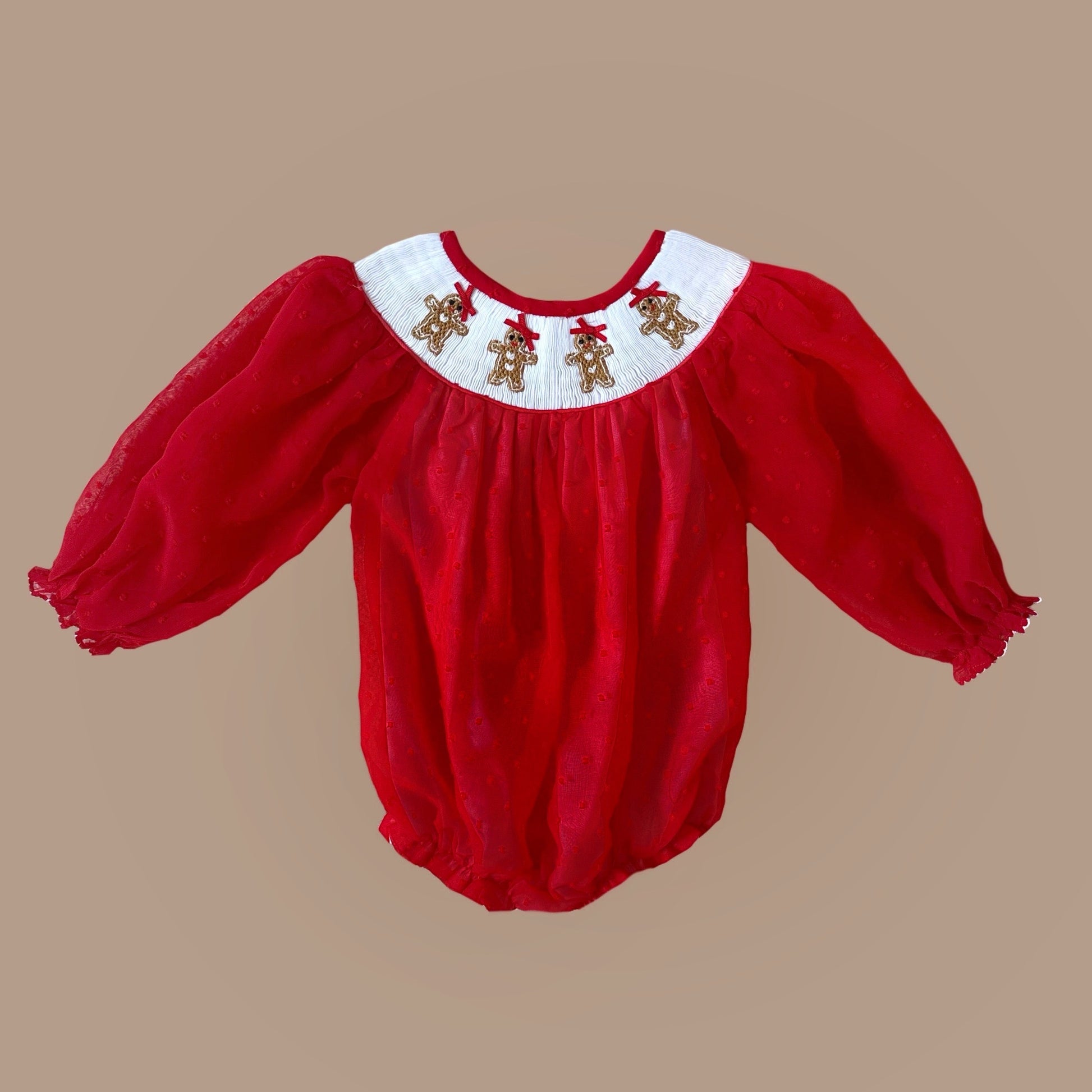 - This red bubble is made in a soft quality Swiss dot fabric and is the perfect fit for the holiday season! It features gingerbreads with bows