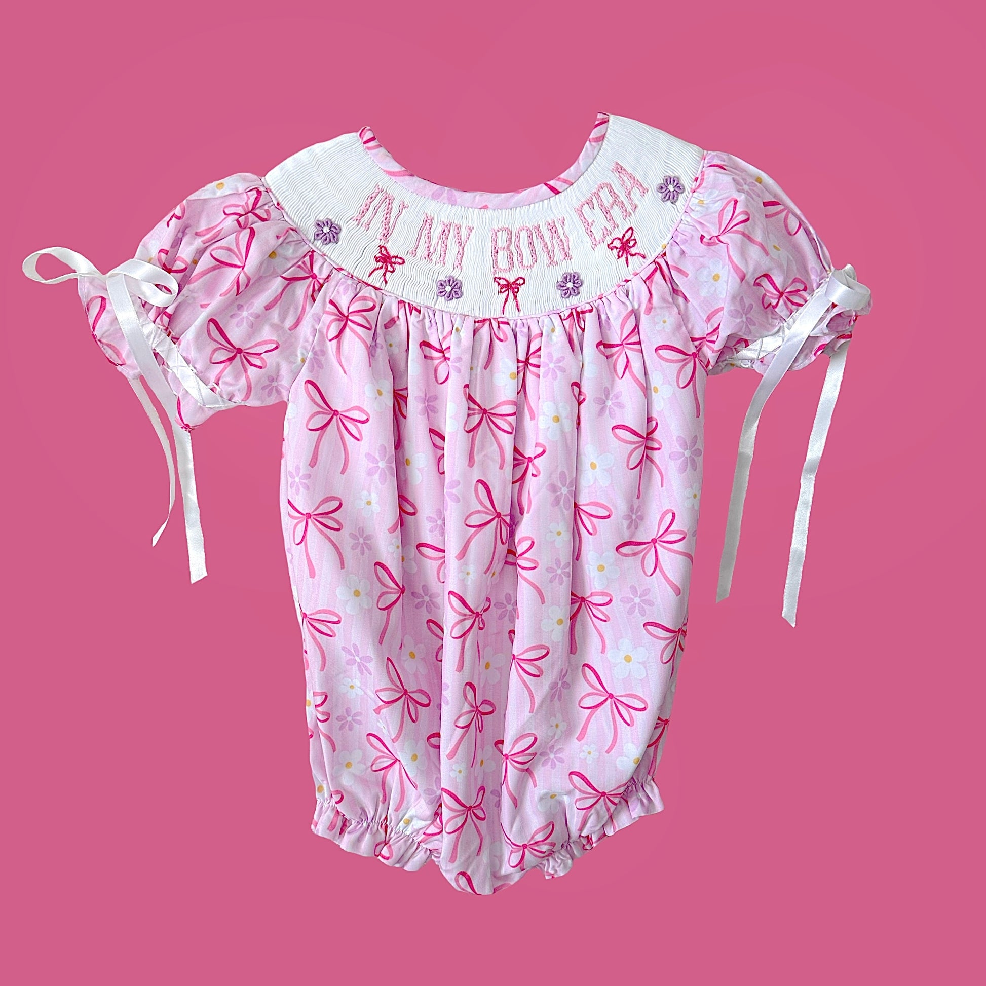 - This floral bow print bubble has a white smocking plate with “in my bow era” hand-smocked above small bows and flowers! A perfect piece for the girly girl in your life living in her bow era!