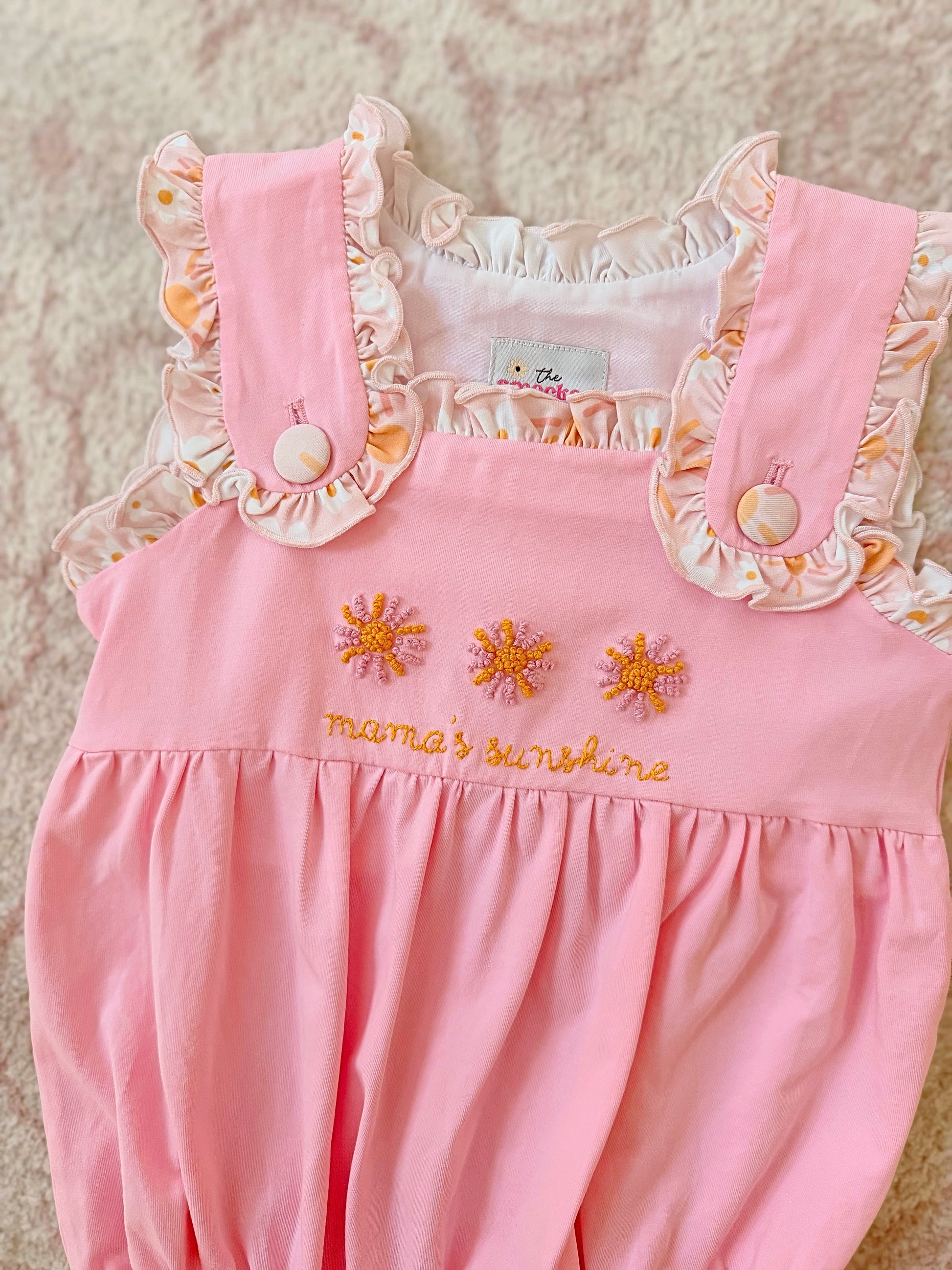 -This pink bubble features your French knot sums with “mama’s sunshine” embroidered