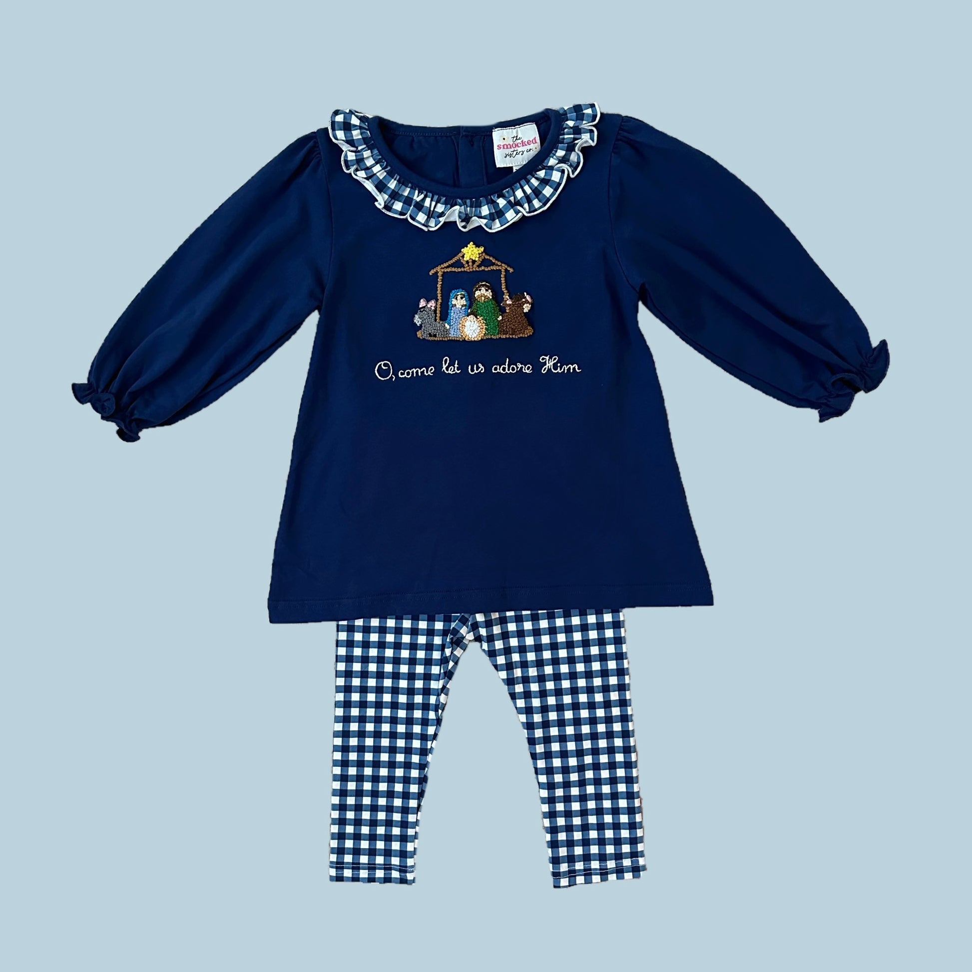 - Celebrate the Christmas season with this true reason for the season legging set - This navy legging set is created in a soft, quality knit fabric featuring a nativity scene in French knot