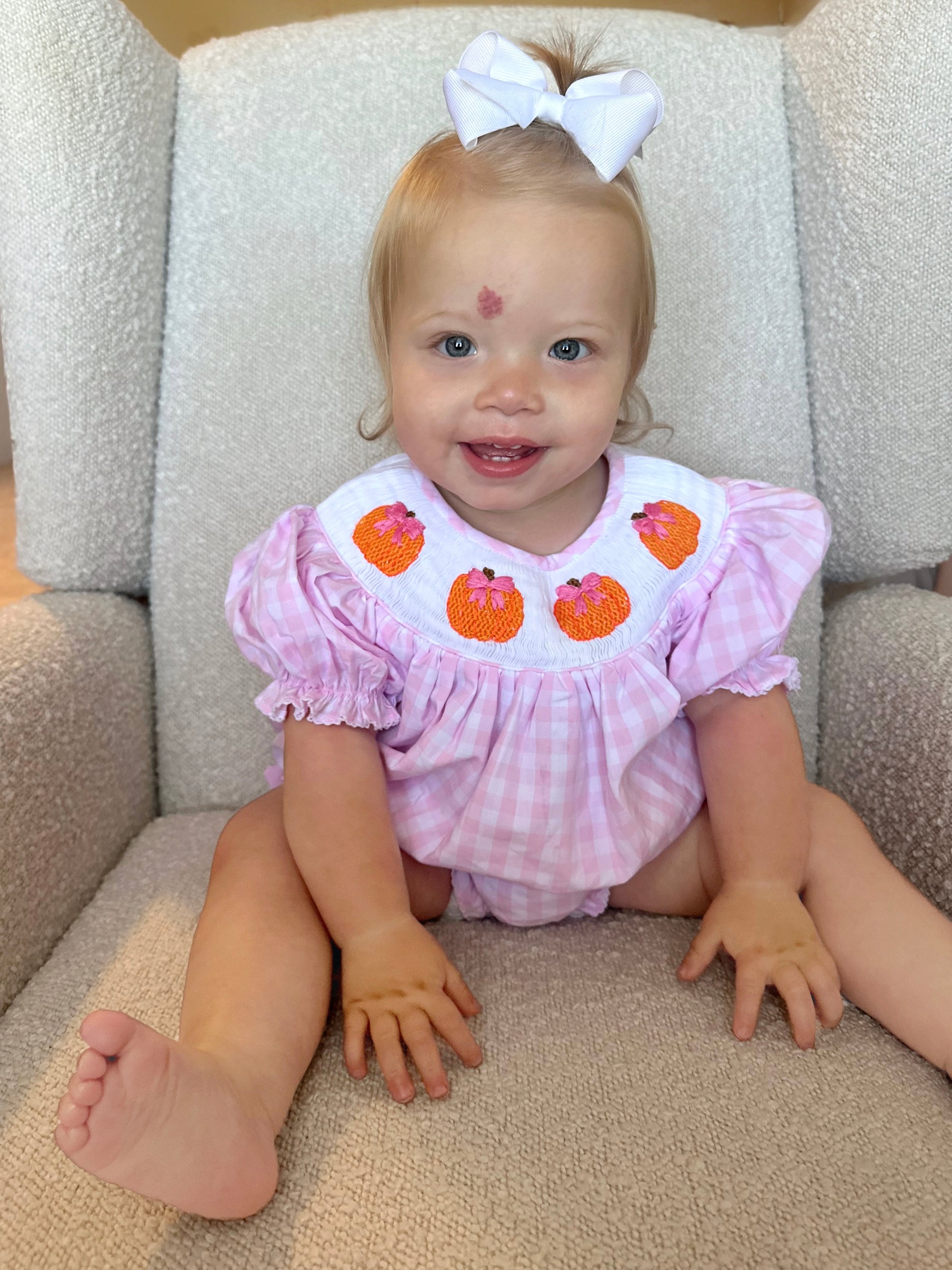 -This pink gingham bubble is made in a soft, quality woven fabric featuring 4 hand-smocked pumpkins with pink bows on them on a white smocking plate