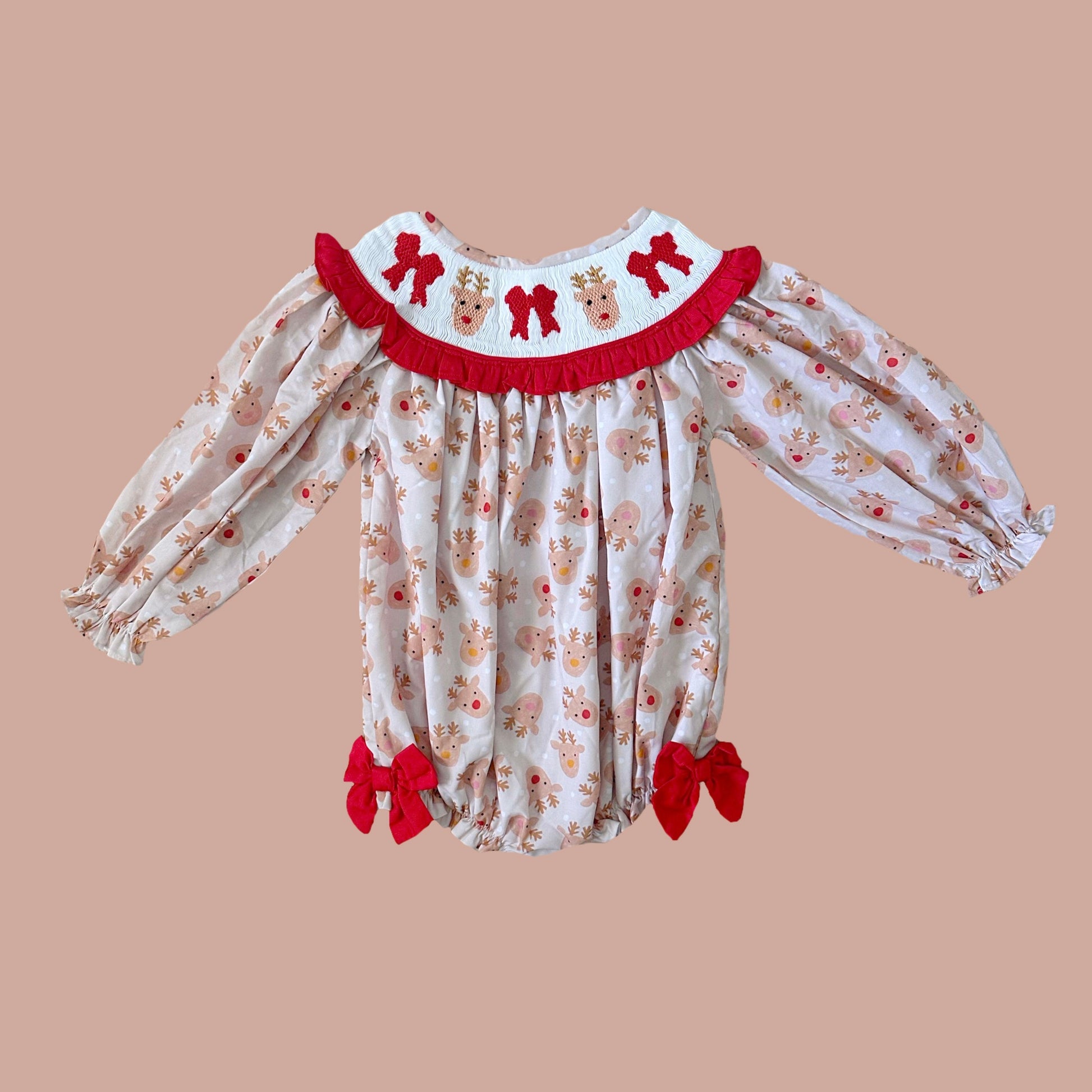 - This reindeer printed bubble is made in a soft quality woven fabric and is a sweet, unique outfit for the holidays!
