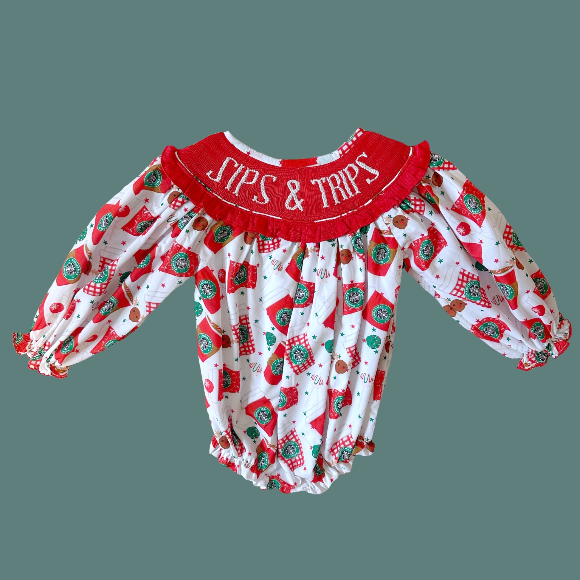 - This woven, holiday coffee + cake pop printed bubble is made in a soft quality fabric and is a perfect fun holiday outfit! It features “SIPS & TRIPS” in white thread on a red smocking plate!