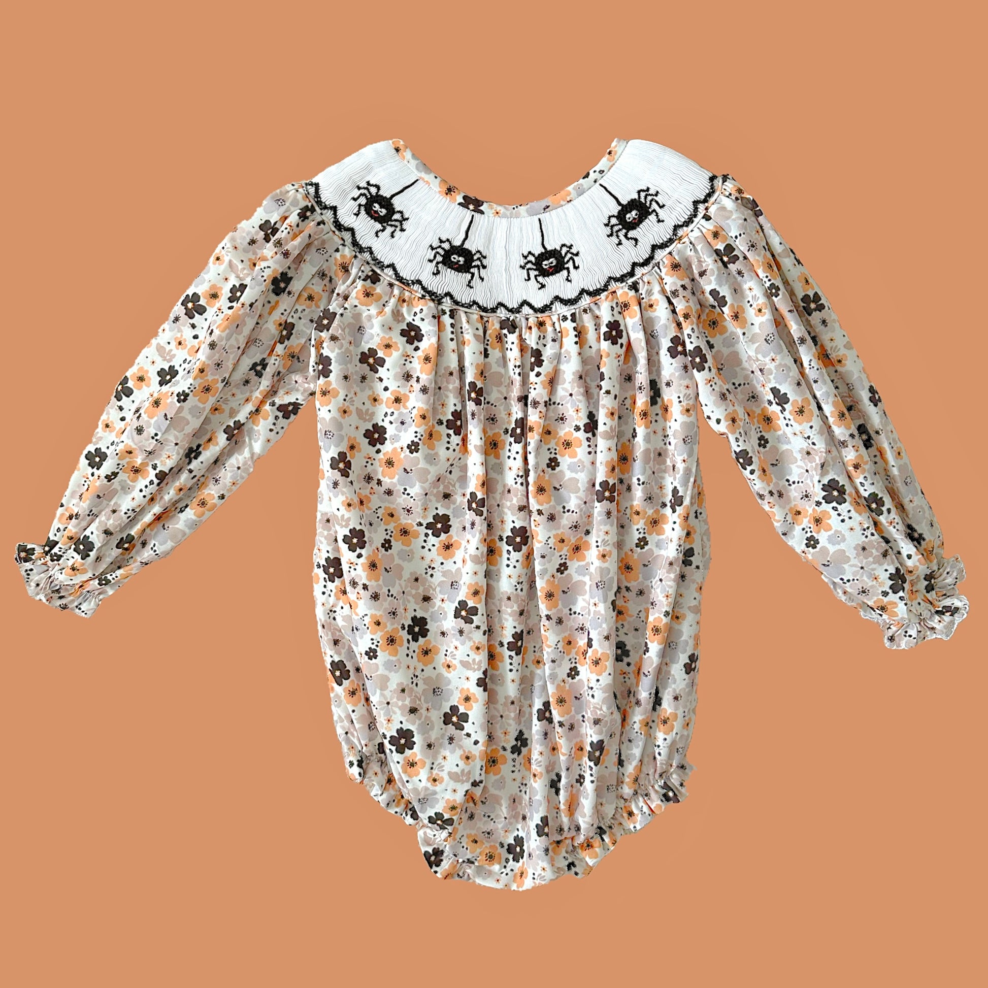 - This spooky floral bubble is made in a soft quality fabric with hand smocked spiders around the neck