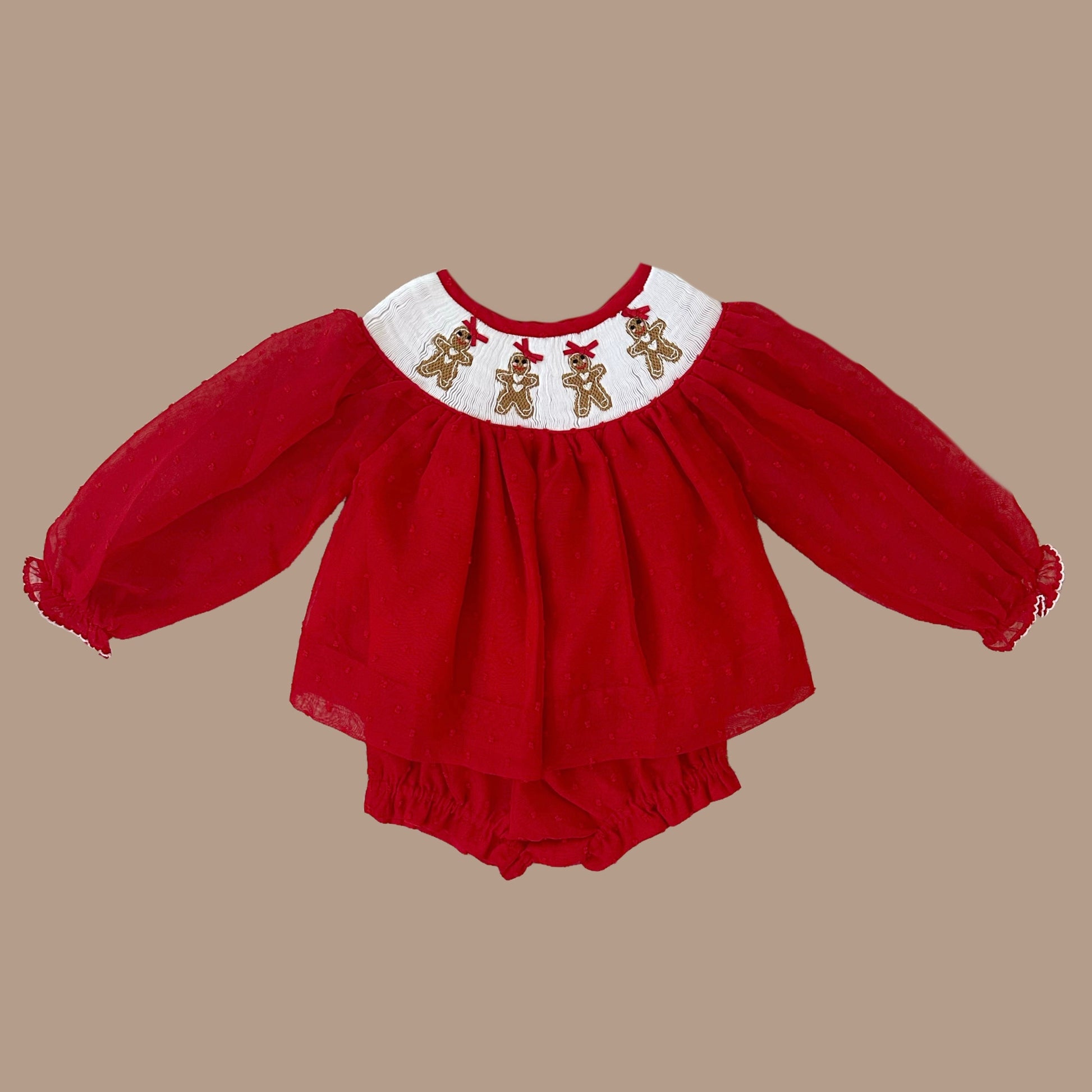 This red diaper set is made in a soft quality sheer Swiss dot fabric and is the perfect fit for the holiday season! It features gingerbreads with 3D bows
