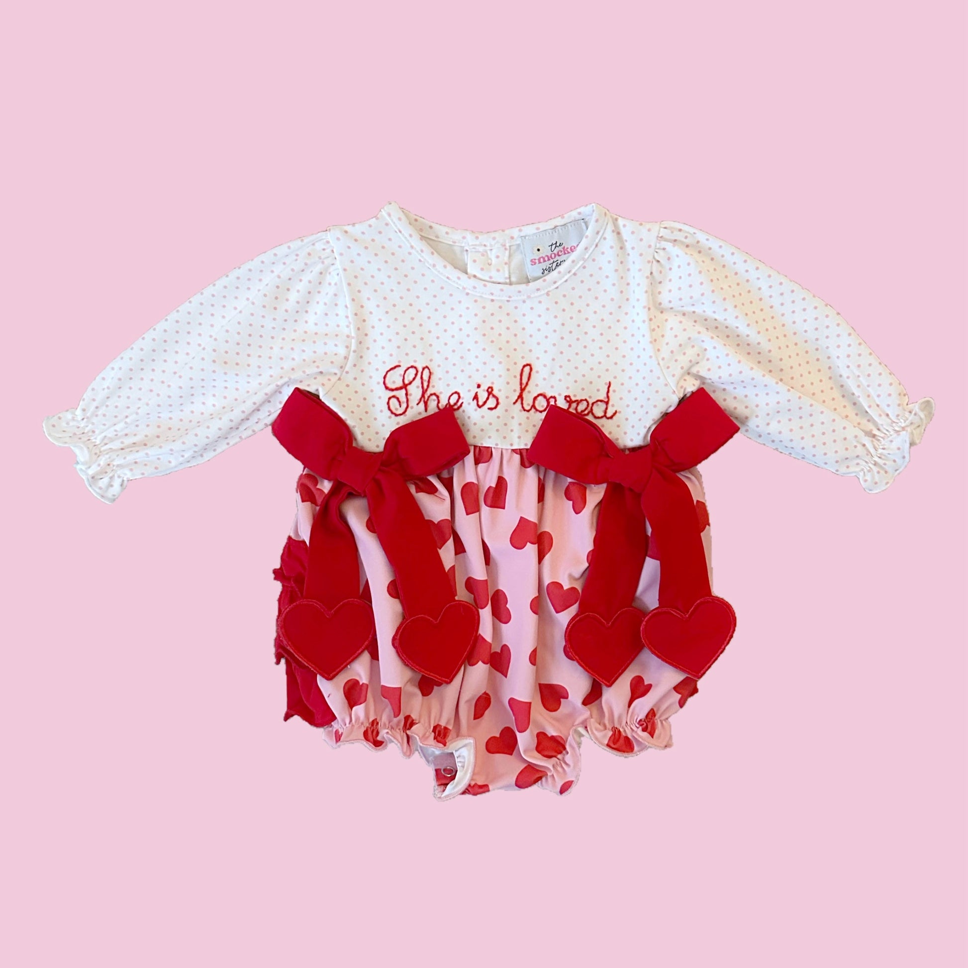 - This bubble is made in a soft quality knit fabric and is the perfect comfy Valentine’s Day outfit! It features “she is loved” with hanging hearts